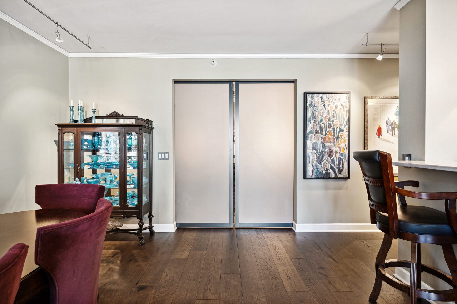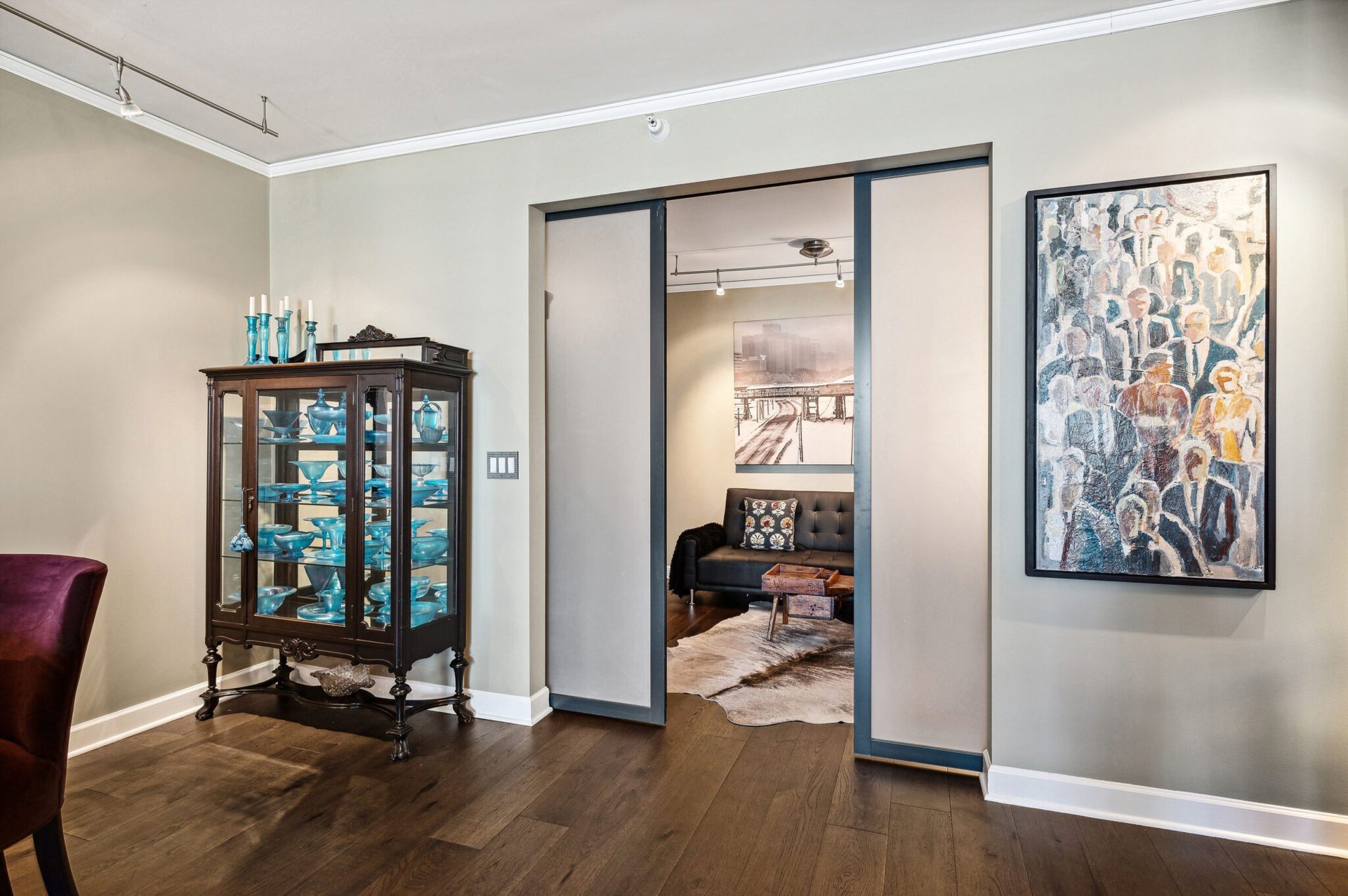 The versatile floor plan includes a third bedroom off the expansive living/dining space, with frosted glass sliding barn doors that can be closed for privacy or opened for a more spacious feel.