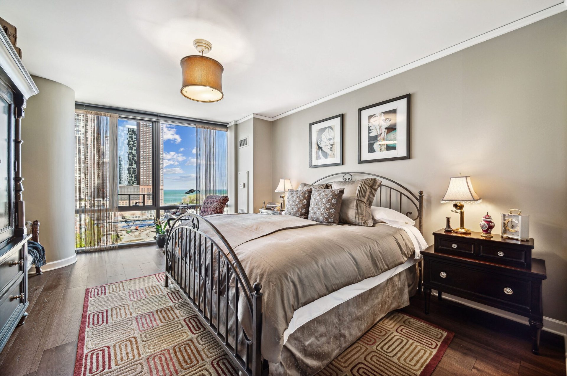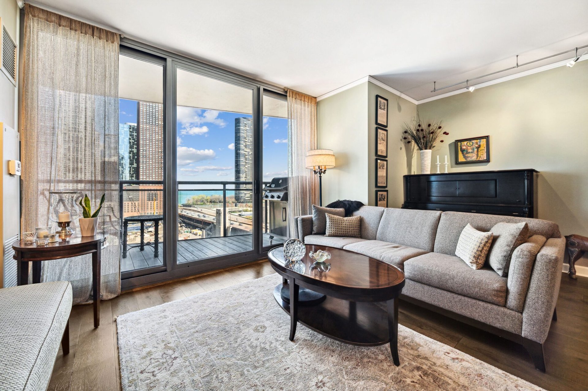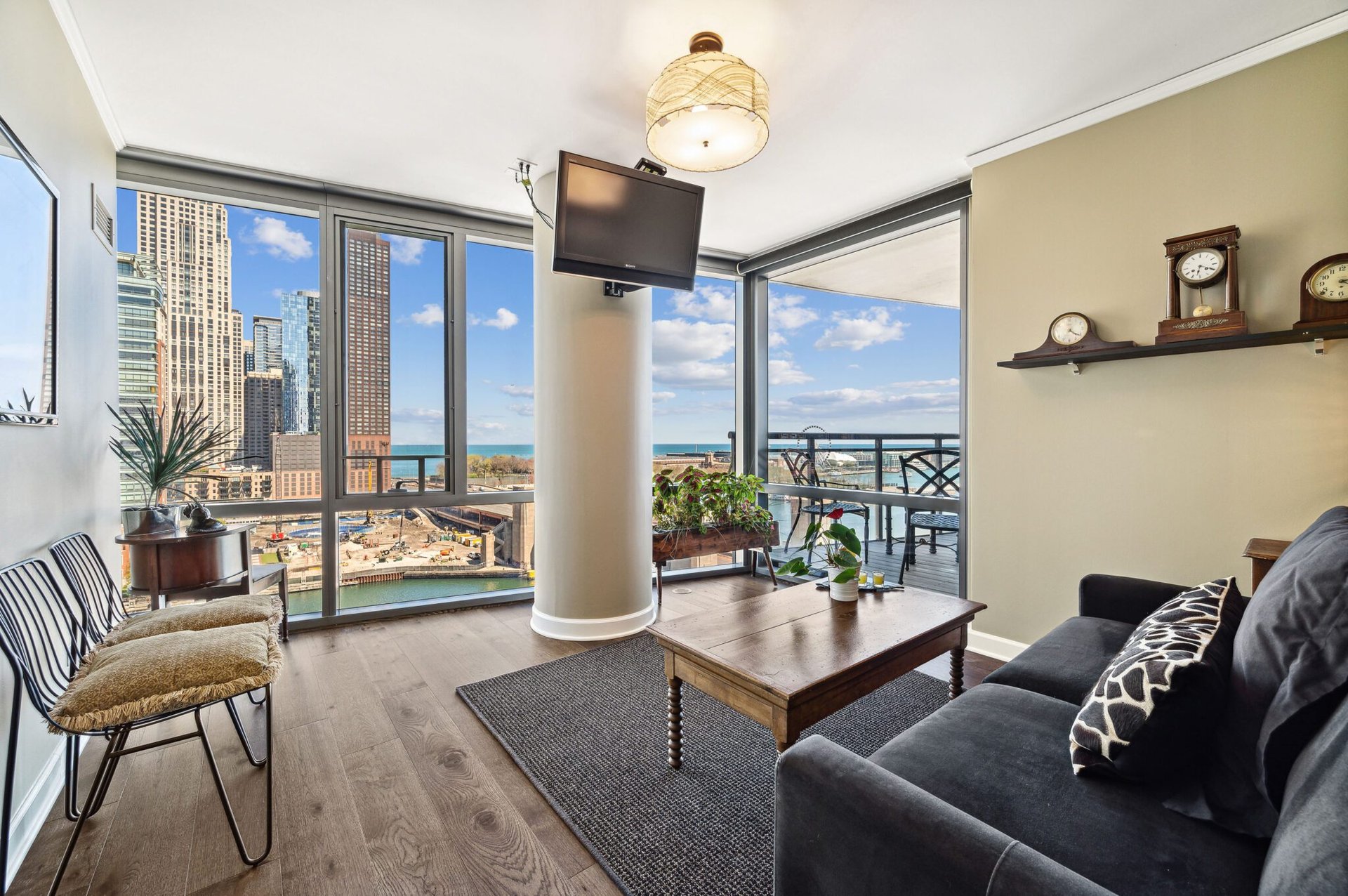 Chandler, located at 450 E Waterside Dr., Chicago, IL. This three-bedroom, two-and-a-half-bath residence features floor-to-ceiling windows in every room, providing picturesque, unobstructed views of the water and cityscape along with abundant natural light.