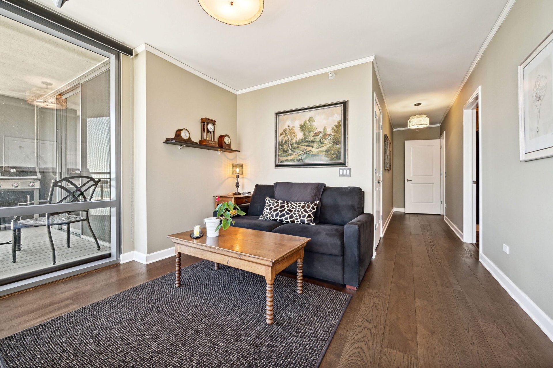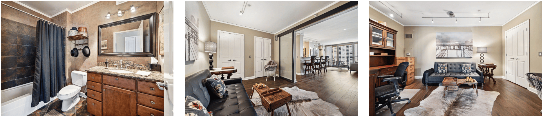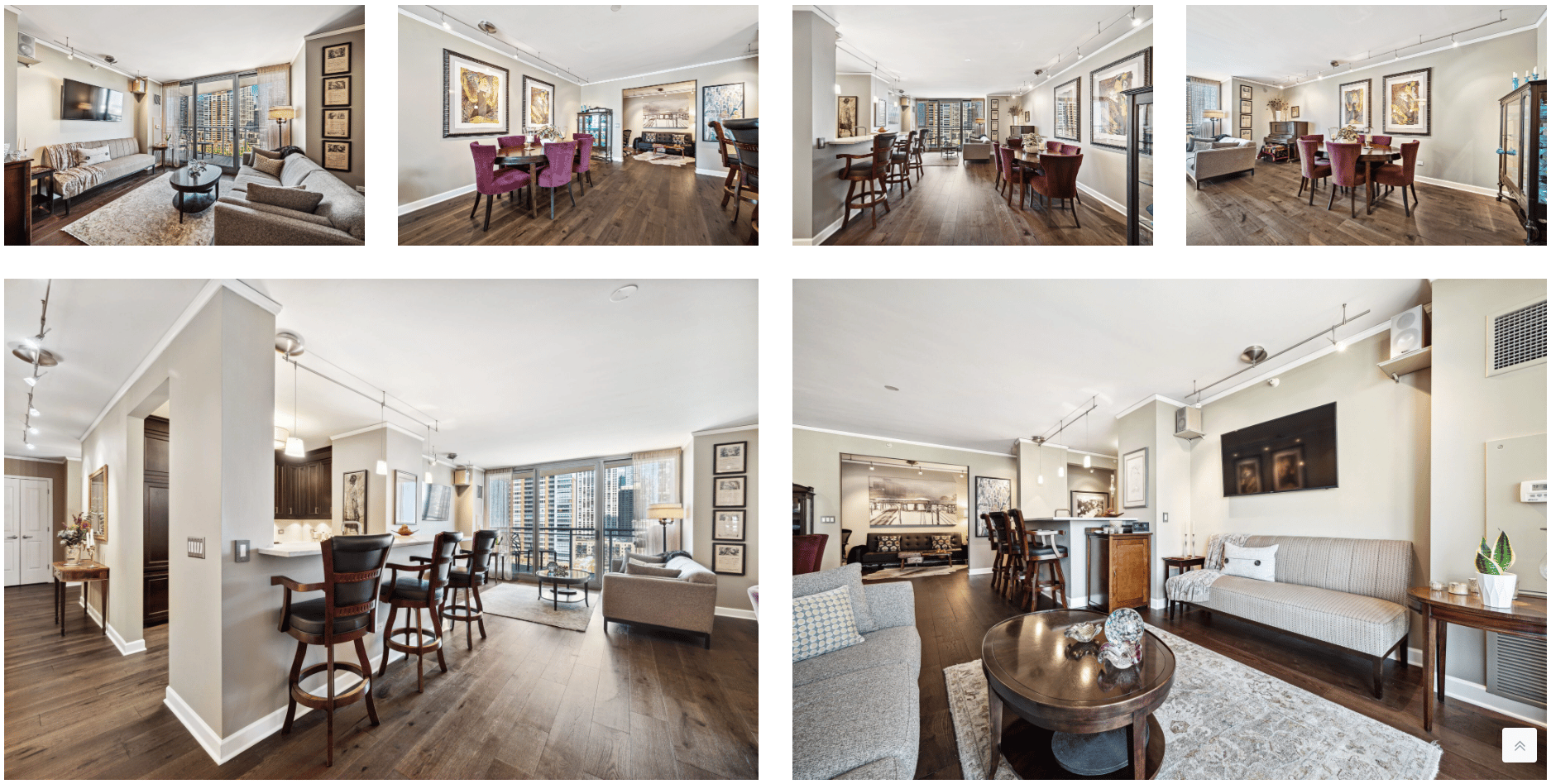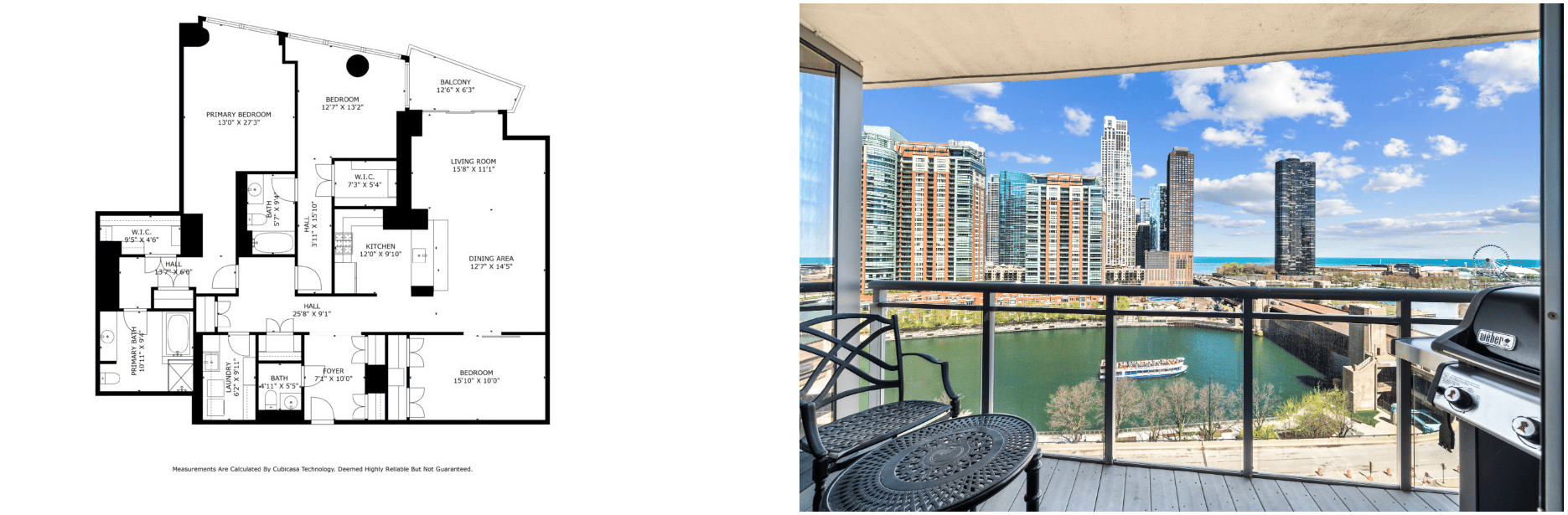 Chandler, located at 450 E Waterside Dr., Chicago, IL. This three-bedroom, two-and-a-half-bath residence features floor-to-ceiling windows in every room, providing picturesque, unobstructed views of the water and cityscape along with abundant natural light.
