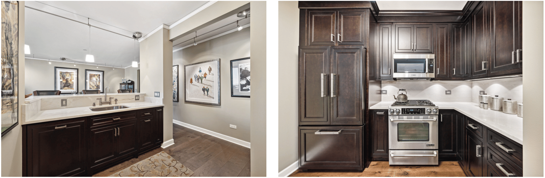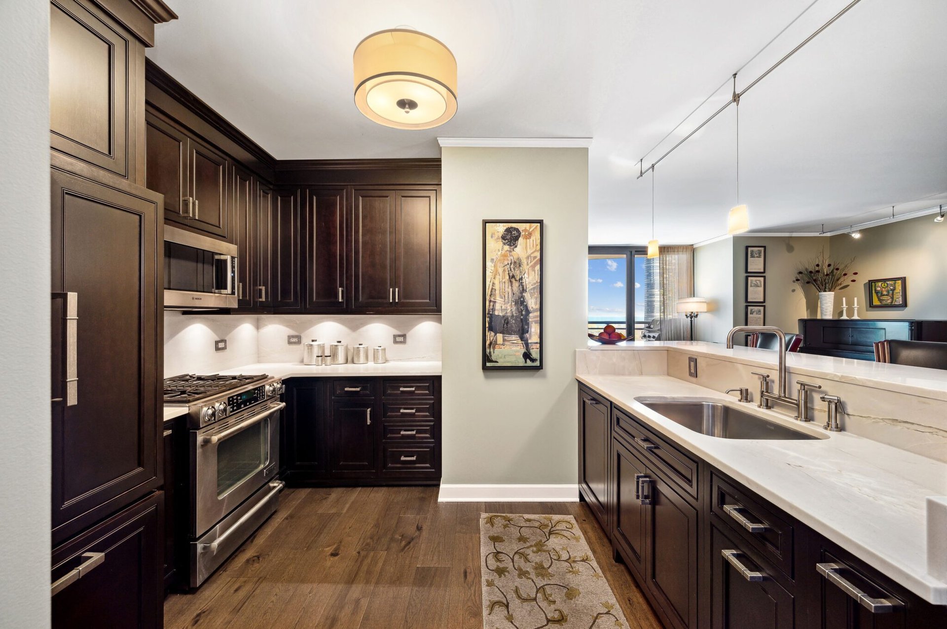 The newly remodeled kitchen boasts custom java-colored cabinets reaching to the ceiling, high-end stainless steel and paneled appliances, a deep stainless steel sink, and