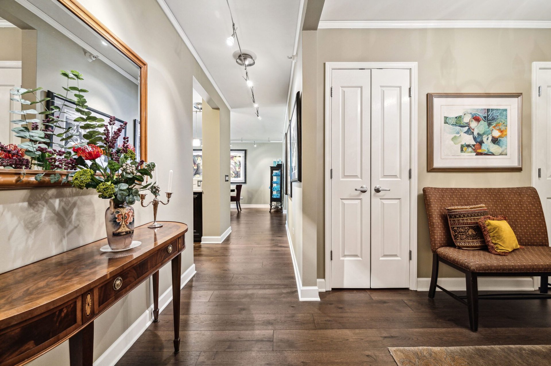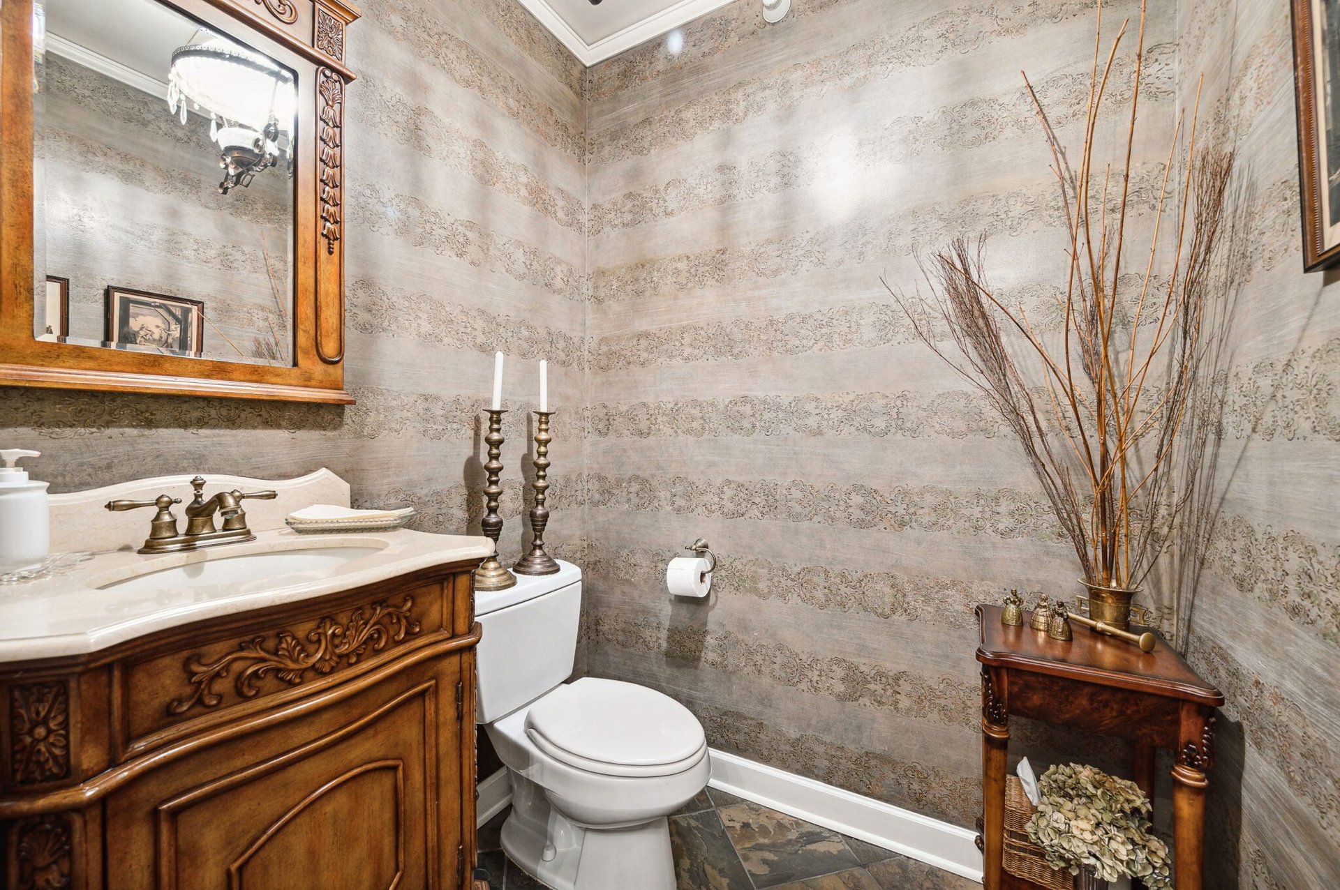 Enter through the grand foyer featuring two coat closets, pantry, linen closet, and a hand-painted powder room with a custom vanity, setting the tone for opulence throughout.