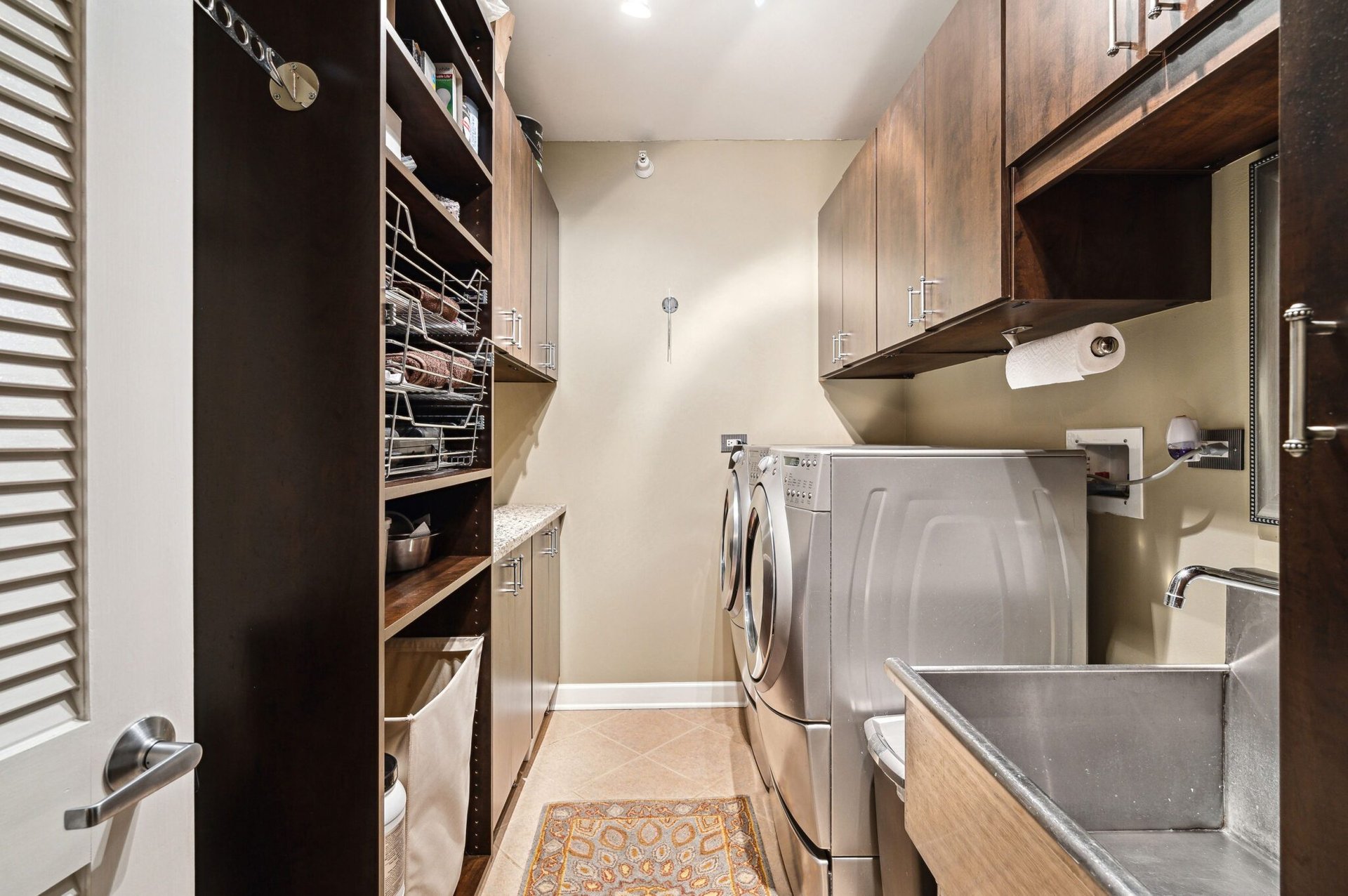 A spacious laundry room includes a full-sized steel-colored side-by-side washer and dryer, a stainless steel utility sink, and custom built-in storage, adding to the convenience.