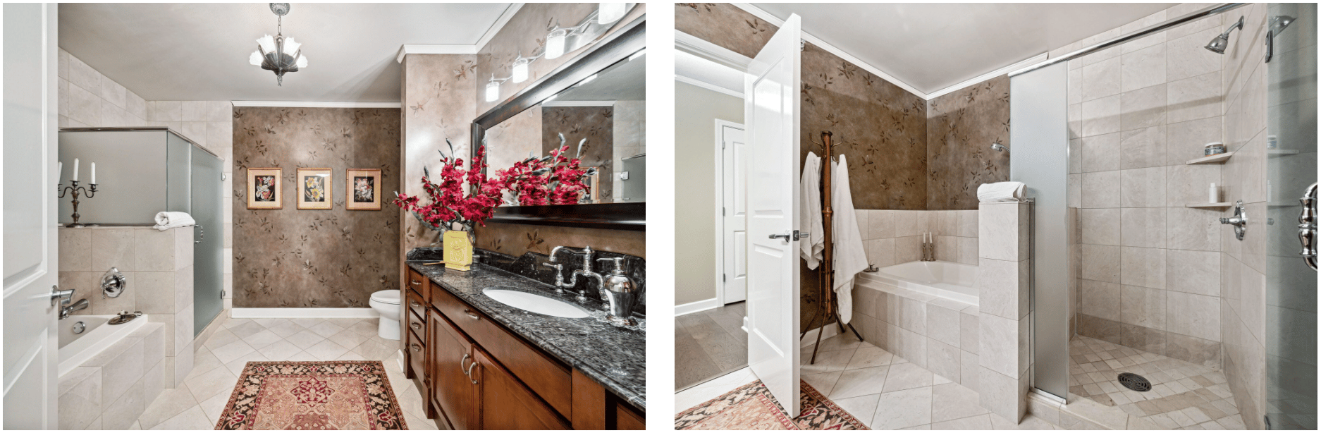 Retreat to the large primary suite with a custom-organized walk-in closet, accessory closet, and a luxurious primary bath featuring a walk-in shower, jetted tub, custom vanity, Rohl bridge faucet, and hand-painted walls.