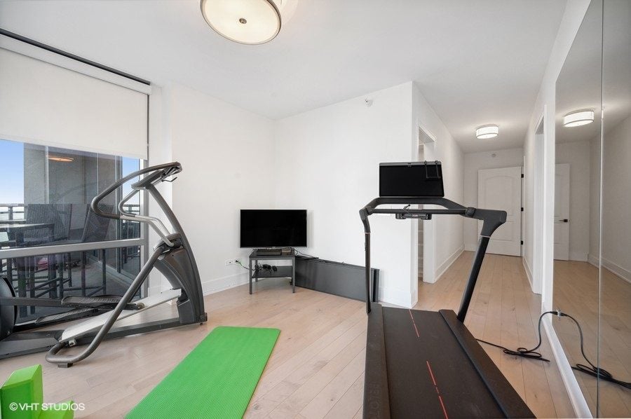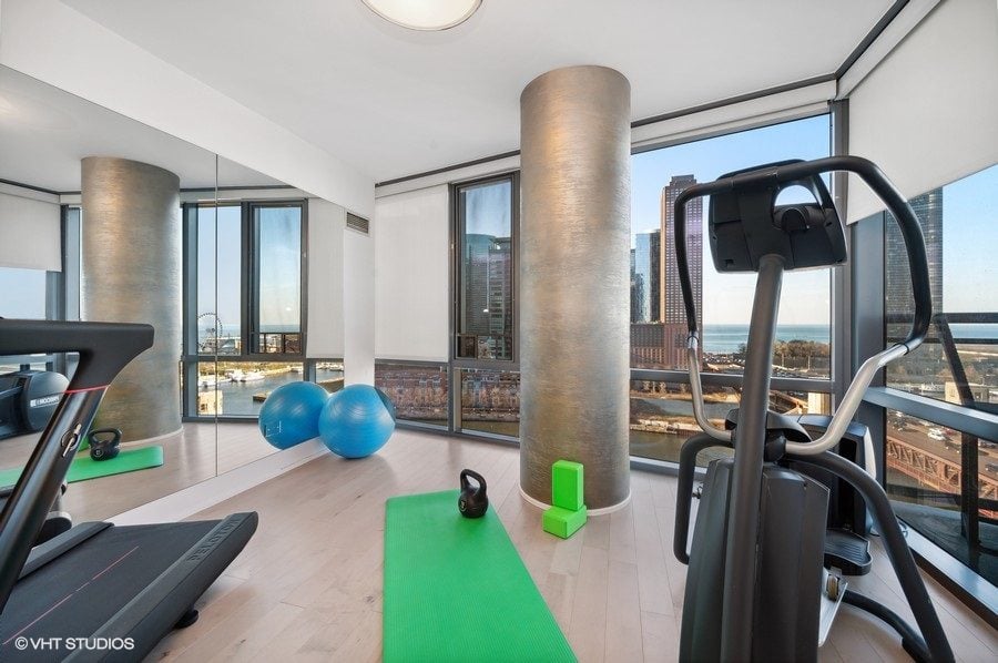 The second bedroom is currently used as a gym, with a walk-in closet and an en-suite bathroom.