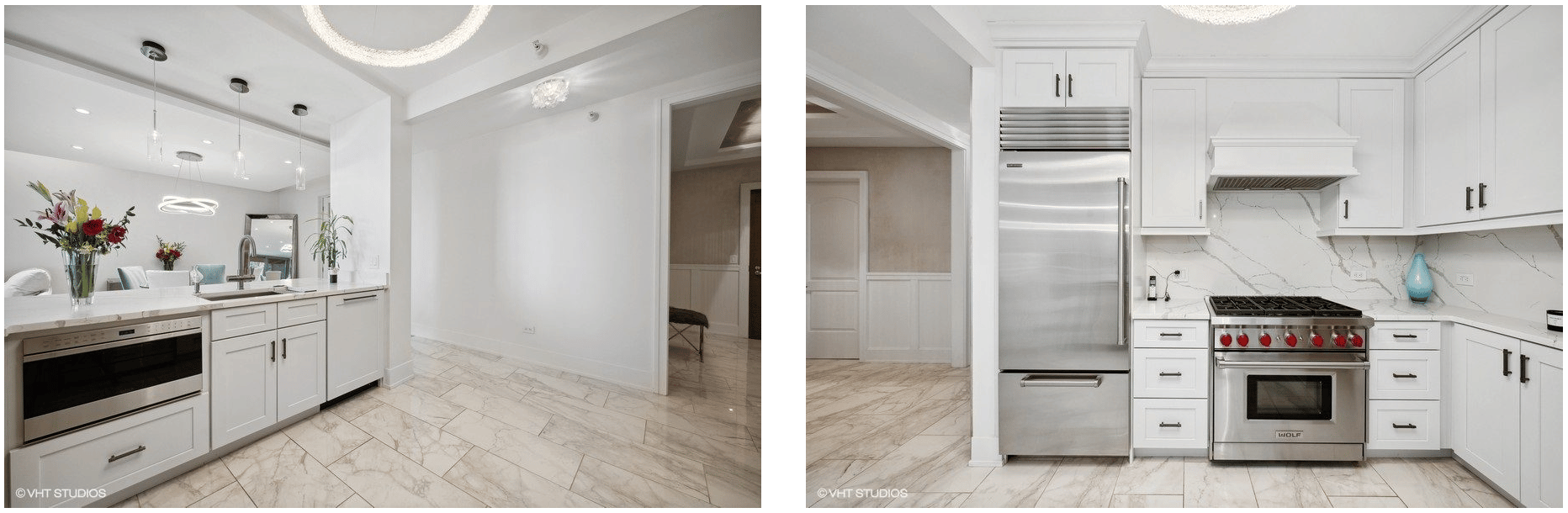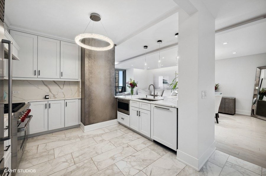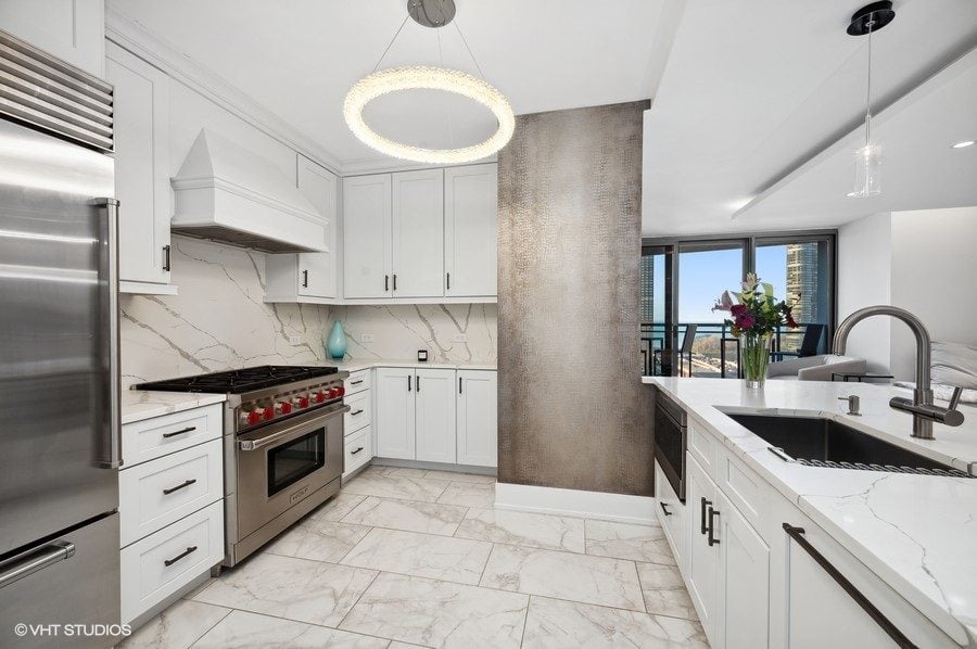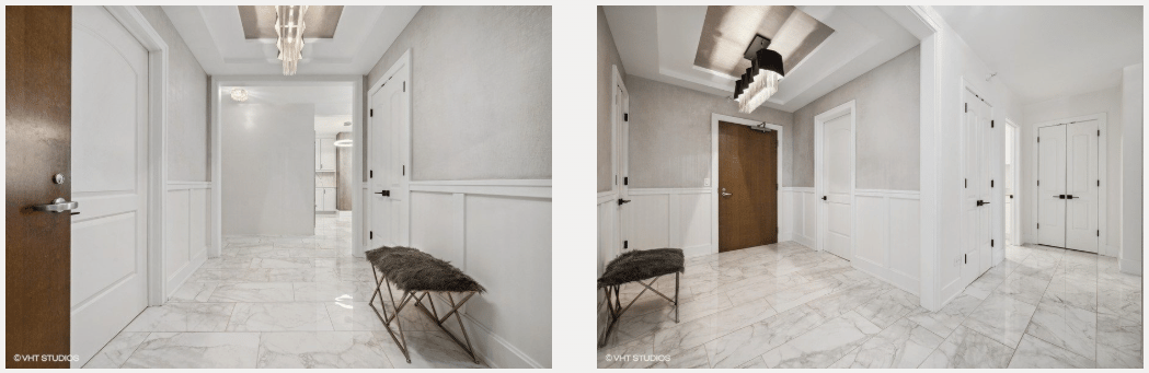 This 2-bedroom, 2.5-bathroom home was completely renovated in 2018 with only the finest materials. As you enter, you'll be greeted by a large foyer featuring custom 24x36 marble flooring, wainscoting, hand-painted walls, inlay ceiling, and a stunning custom-tiled feature wall.