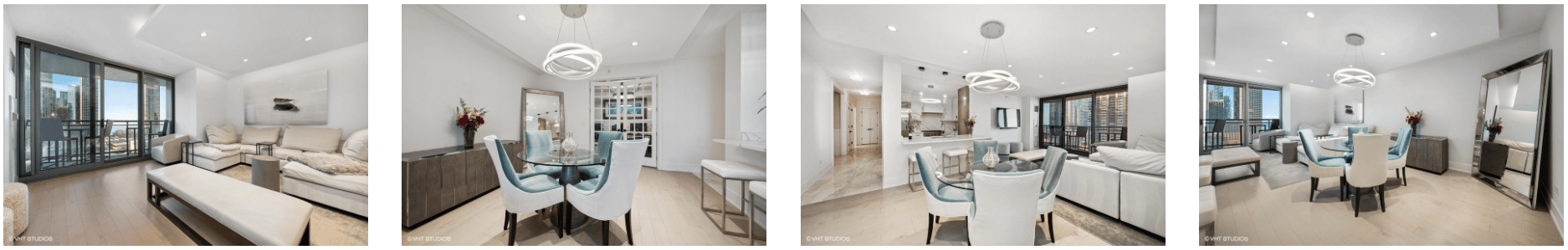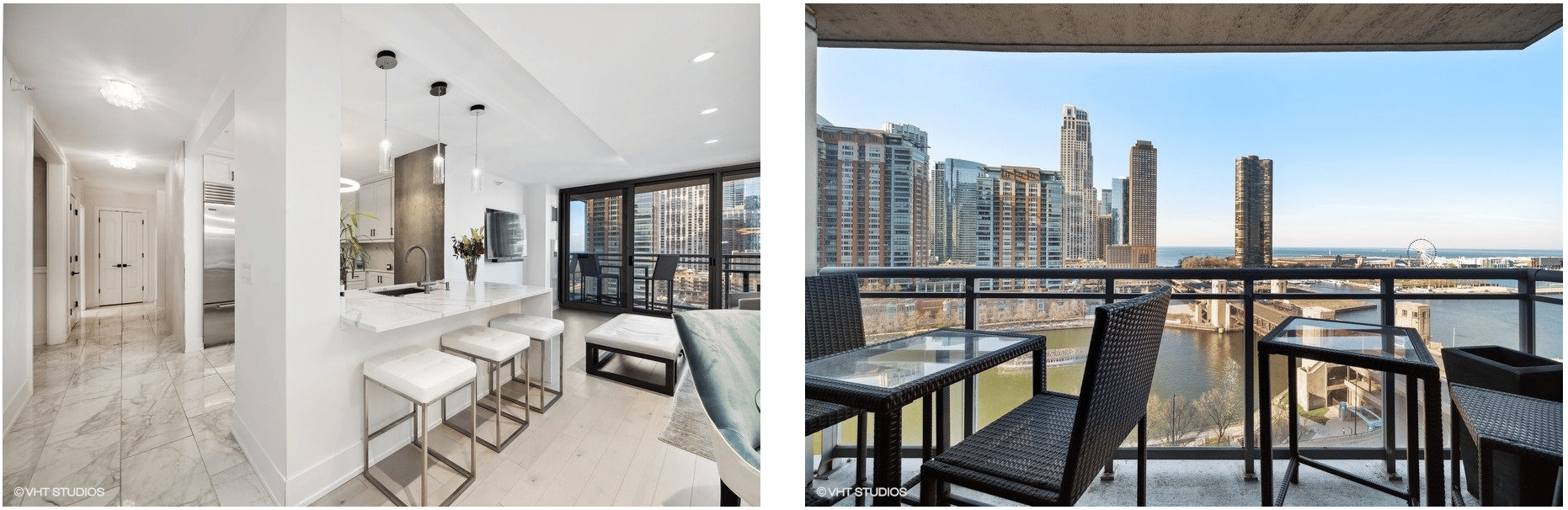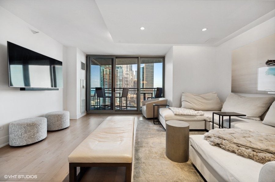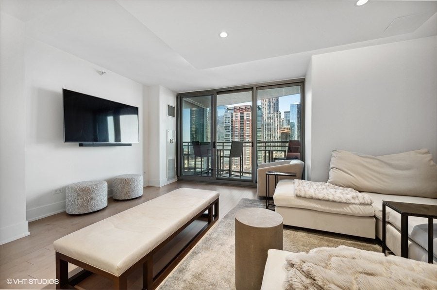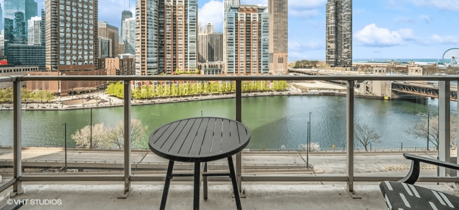 The living/dining area is spacious and boasts a balcony with a fantastic view of Navy Pier.