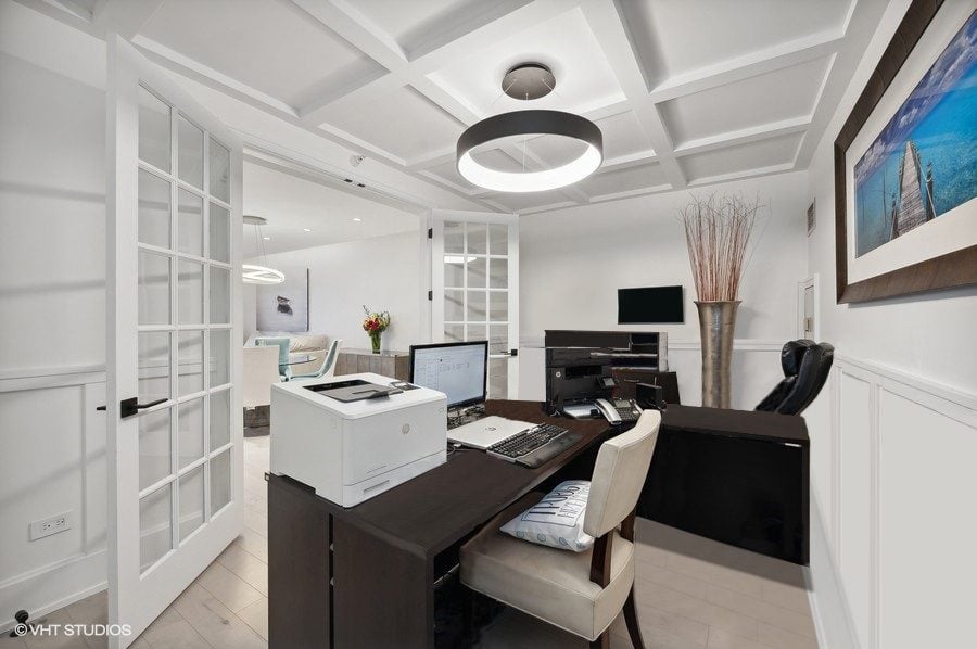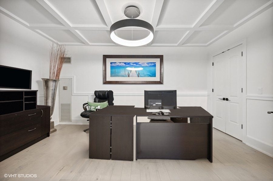 French doors open to a spacious den with custom closets, wainscoting and coffered ceilings. This versatile room adjacent to the living space can be used as an office, media room, nursery, or guest room.