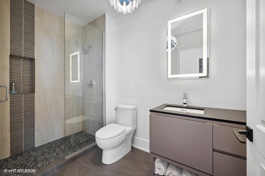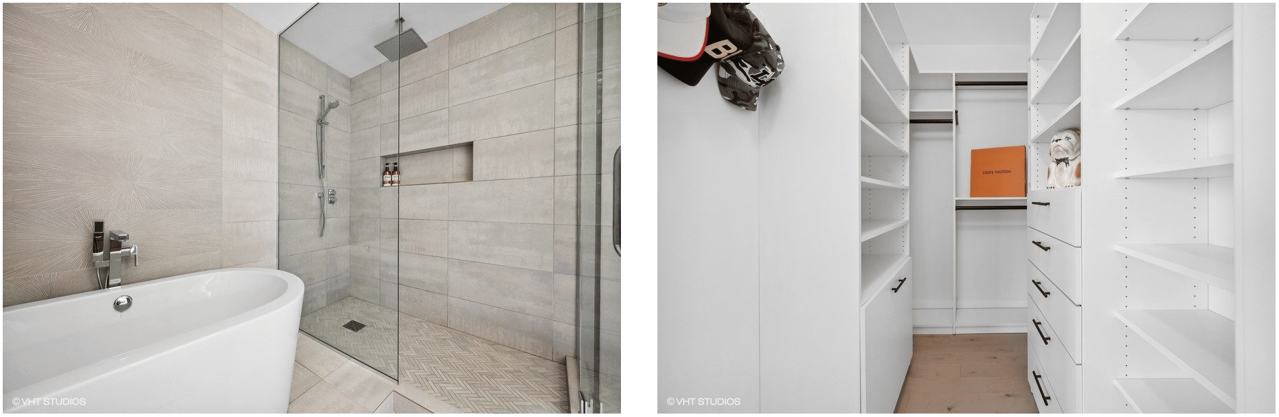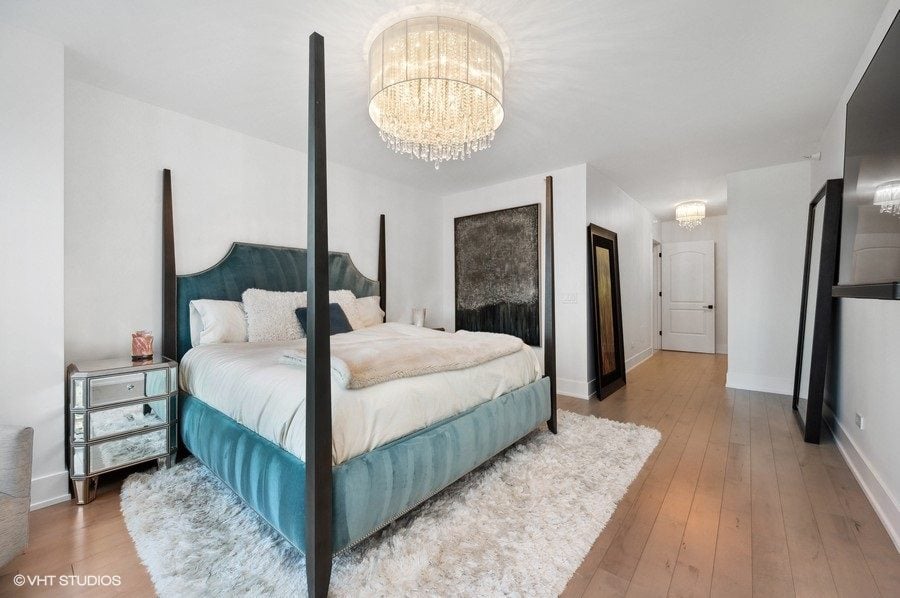 The master suite is grand, with a walk-in custom-organized closet, a master bathroom with all-marble finishes, a separate shower, a freestanding tub, floating vanity and fixtures from Studio 41. Custom lighting from Lightology sets the perfect ambiance.