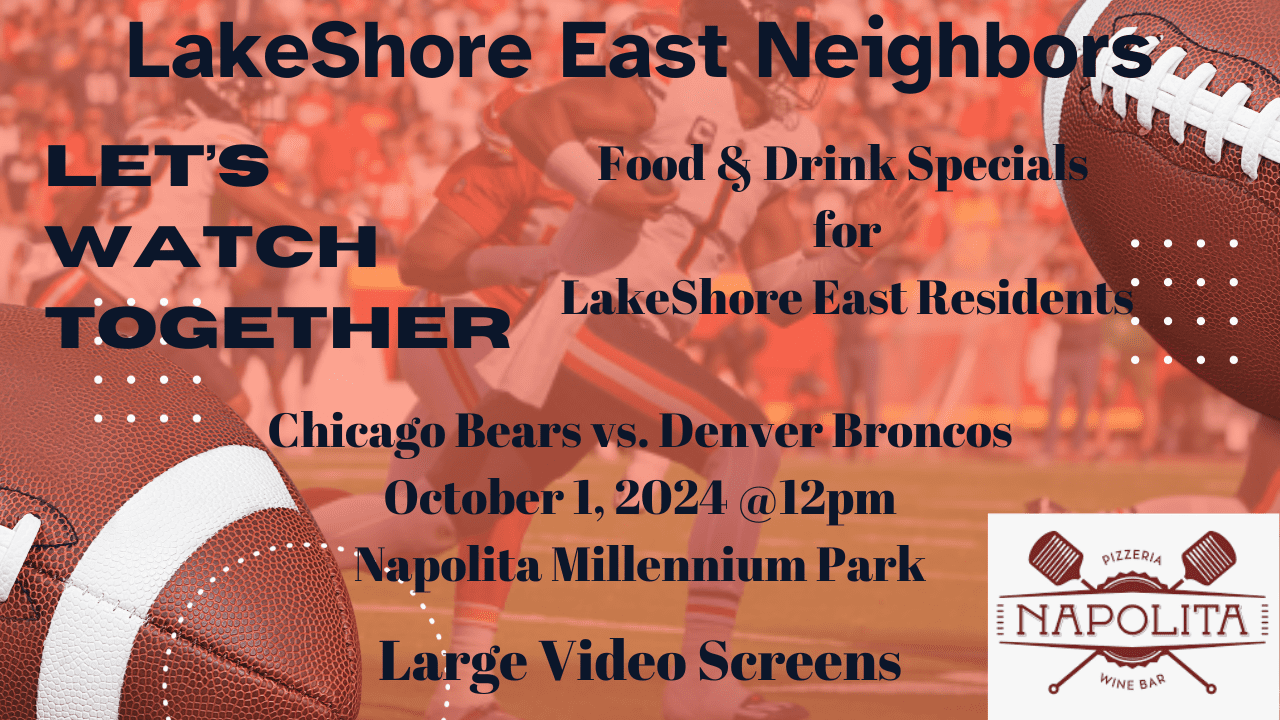 Join us for an exciting LakeShore East Bears Viewing Event at Napolita, situated in Millennium Park! On October 1st @ 12 pm, broadcast on large screens, enjoy a neighborly gathering to root for the Bears against the Broncos. Exclusive food & drink specials are on offer for Lakeshore East residents. Join the camaraderie!