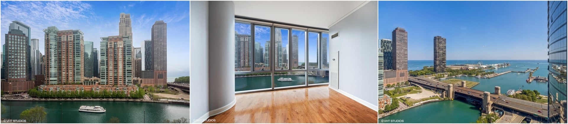 Greet the passing boaters! Enjoy the vistas of the Chicago River, Navy Pier, Lake Michigan, and the city's radiant illuminations. This spacious one-bedroom plus den/1.5 bath unit measures 1156 square feet and boasts floor-to-ceiling windows.
