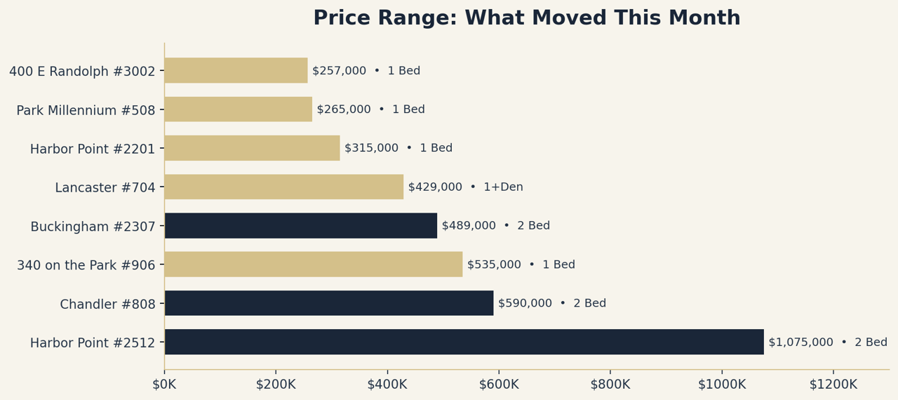 This one tells the story better than any of them. A southwest-facing corner two-bedroom at the Chandler with lake, river, park, and city views. Freshly painted, move-in ready, split floor plan with a jacuzzi tub and double vanity in the primary bath. It went under contract in three days with multiple offers and a highest-and-best call. Parking was available for $45,000 additional. When a well-priced two-bedroom hits in a building with limited inventory, buyers don’t wait.