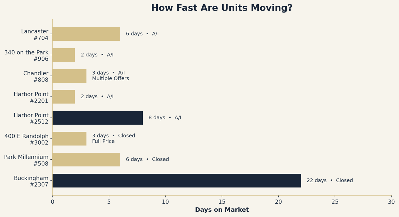I pulled every sale that went under contract in our neighborhood in the past three weeks—units that are either already closed or currently pending. Eight transactions across six buildings. The price range spans $257,000 to $1,075,000. And the headline number? Five of the eight went under contract in six days or less.